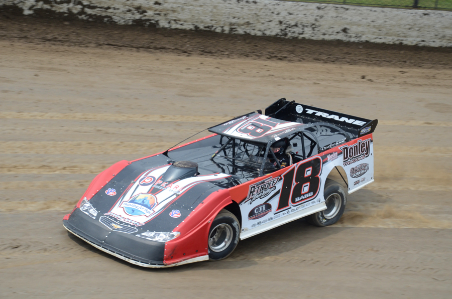 Shannon Babb on the gas during the 'Dirt Late Model Dream' weekend at Eldora (OH) Speedway in June 2018